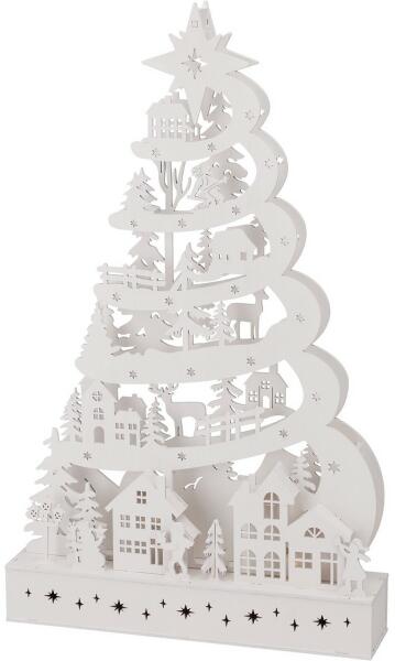 Varázsoljon varázslatos karácsonyi hangulatot otthonába ezzel a gyönyörűen kidolgozott, karácsonyfa alakú, világító faluval. A dekoráció 15 meleg fehér színű LED-lámpával van felszerelve, amelyek finoman megvilágítják otthonának minden zugát. Ez a gyönyörű dekorációs elem ideális ablakpárkányra, polcra vagy komódra. Könnyen elhelyezhető bárhol, és varázslatos karácsonyi világítást teremt anélkül, hogy elektromos csatlakozóra lenne szükség. Műszaki adatok: