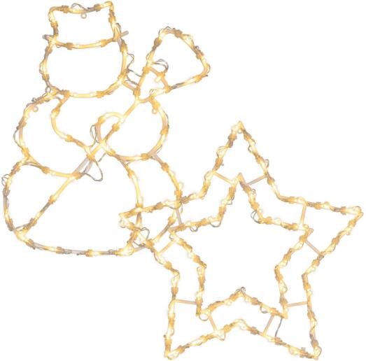 Hóemberből és csillagból álló 2 ablakképből álló dekoratív készlet, mindegyikben 35 meleg fehér LED, 60 cm-es vezeték átlátszó kábellel. A praktikus szívótartónak köszönhetően az ablakdísz sokféleképpen használható akár ablakon, ajtón vagy falon  karácsonyi dekoráció, amely ünnepi hangulatot varázsol lakóterébe. Az akkumulátoros működés azt jelenti, hogy független az aljzatoktól, így a témák széles körben elhelyezhetők. Csak a belső terekben használható, az IP20 védelmi osztály garantálja a biztonságot. Az energiatakarékos 35 LED motívumként alacsony energiafogyasztást biztosít. Egészítse ki karácsonyi dekorációját más nagyszerű téli, karácsonyi és nyári fénydekorációkkal, mint például tündérlámpákkal, fényfákkal, fényhálókkal, fényfüggönyökkel, labdákkal, csillagokkal, rénszarvasokkal, lámpásokkal és gyertyákkal. Termék részletek: