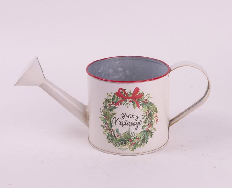 Bádog kanna Boldog Karácsonyt koszorús mintával. Hossza 24 cm, magasság 12 cm, mélység 11 cm.