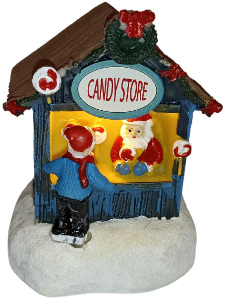 Építsd meg saját mesebeli karácsonyi falvadat, melyben mindíg esik a hó, és hangulatos karácsonyi dalok szólnak. Cukorkabolt - karácsonyi jelenet, az apró karácsonyi faluba. Cuki kiegészítője lehet karácsonyi faludnak egy cukorkabolt, ahol a Mikulás méri a cukrot. Mérete: 10x6x5 cm Működése:2 db LR44-es gombelemmel - tartozék Fényforrás: LED Anyag: műgyanta, így sokáig megörző színét,