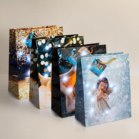 Family Collection Ajándéktasak - 10 hidegfehér LED, papír - 265 x 127 x 330 mm - 4 féle - 12 db/csomag (58325)