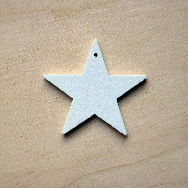 Fehér fa csillag, lyukkal. Mérete: 45 mm