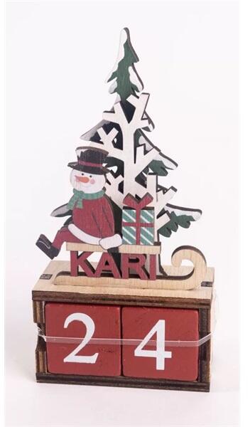 Iris fa adventi kalendárium, hóember szánkón, "kari" felirattal, fenyőfával 14 x 7 cm (061345)