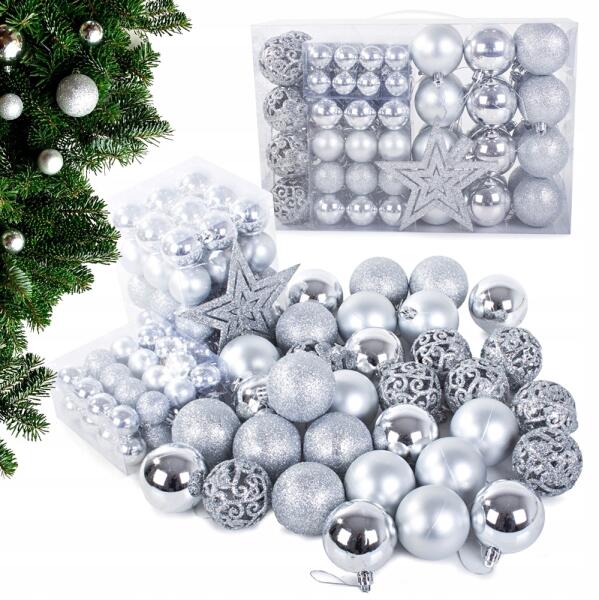 MŰSZAKI ADATOK: Anyaga: műanyag Karácsonyfák díszítésére Különféle kivitelben és méretben Esztétikusan csomagolt Tartós Szín: ezüst MÉRETEK: Nagy gömbök átmérője: ~ 60mm Közepes gömbök átmérője: ~ 40mm Kis gömbök átmérője: ~ 30mm Csillag méretei: 13,5cm x 14cm x 5,5cm A KÉSZLETBEN: 8 db nagy üreges gömb 8 db nagy fényes gömb 8 db nagy glitteres gömb 8 db nagy matt gömb 18 db közepes fényes gömb 9 db közepes glitteres gömb 9 db közepesen csillogó gömb 9 db közepes matt gömb 16 db kis fényes gömb 8 db kis glitteres gömb 8 db kis matt gömb 1 db Csillag