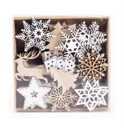 Karácsonyi fa dekoráció, 4cm rénszarvas, fenyőfa, hópehely, csillag 72db/csomag natúr/fehér