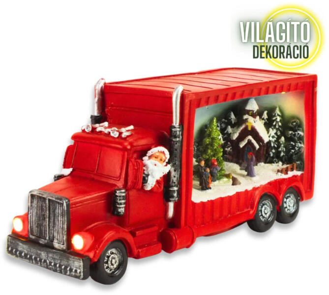 Igazán egyedi, ünnepi hangulatot biztosító piros világítós kamion. Mikulás kamionja, amibe bekukkantva egy kisváros makettje bújik meg, házakkal, égbolttal, arany forgó fenyővel és a város lakóival. Részletesen kidolgozott dekoráció, LED világítással, Működése: