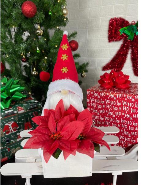 30-35 cm magas prémium minőségű anyagokból, antiallergén tömőanyag felhasználásával készült, élethű szilikon növényekkel díszített, tüneményes  manók kezükben fából készült 11x11x10 cm méretű, élethű, magas minőségű selyemvirágokkal kézzel díszített fadobozzal.