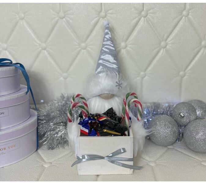 30-35 cm magas prémium minőségű anyagokból, antiallergén tömőanyag felhasználásával készült, élethű szilikon növényekkel díszített, tüneményes  manók kezükben fából készült 11x11x10 cm méretű, élethű, magas minőségű selyemvirágokkal kézzel díszített fadobozzal.