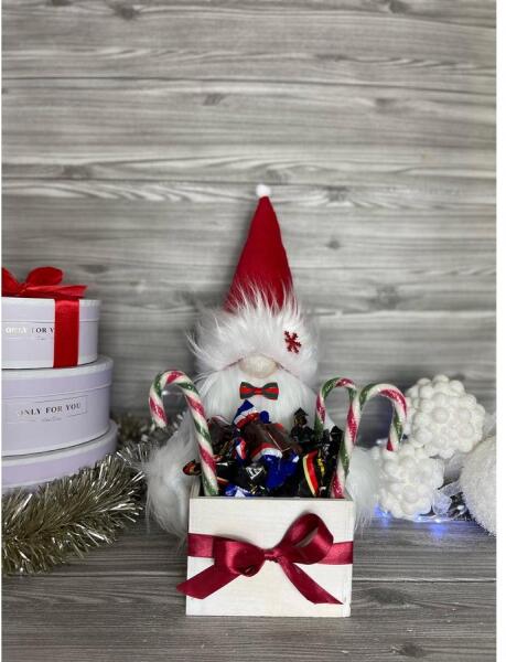 30-35 cm magas prémium minőségű anyagokból, antiallergén tömőanyag felhasználásával készült, élethű szilikon növényekkel díszített, tüneményes  manók kezükben fából készült 11x11x10 cm méretű, élethű, magas minőségű selyemvirágokkal kézzel díszített fadobozzal.