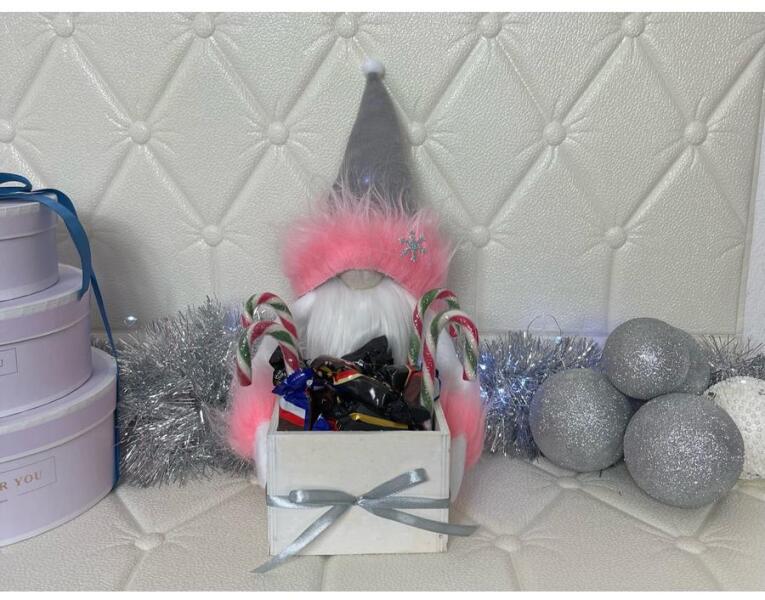 30-35 cm magas prémium minőségű anyagokból, antiallergén tömőanyag felhasználásával készült, élethű szilikon növényekkel díszített, tüneményes  manók kezükben fából készült 11x11x10 cm méretű, élethű, magas minőségű selyemvirágokkal kézzel díszített fadobozzal.