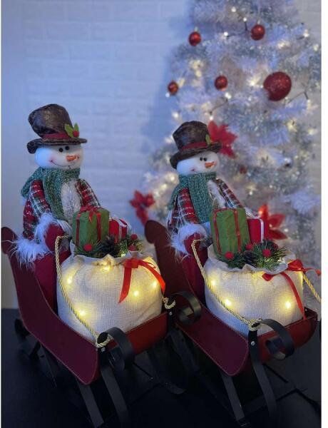 Manóvilág óriás, Szánkón ülő Hóember Ledvilágítással | Piros Kockás / Kalapban | 60x50x20 Cm