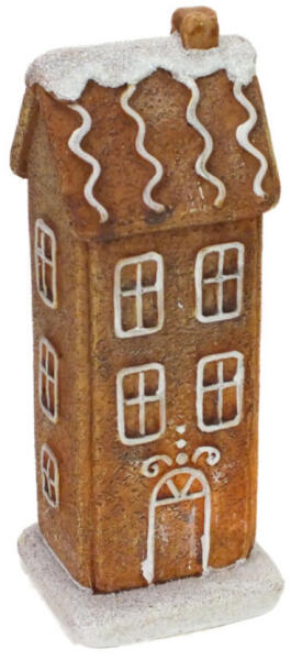 Mézeskalács mintájú emeletesházikó. A dísz 2 db LR44 típusú elemmel működik, mely tartozék. Mérete: 6,4x5,9 mag. : 16cm