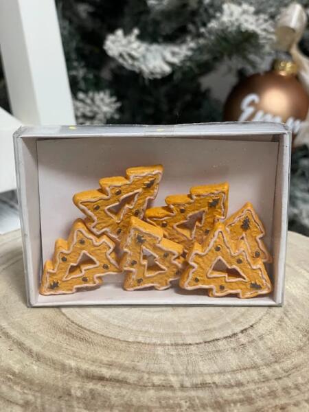 Mézeskalács karácsonyfa 6db-os szett papírdobozban. Anyaga: polirezin. Méret: 3cm x 3cm