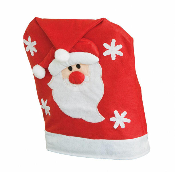 Mikulássapka formájú, domború mikulás mintával ellátott székdekoráció az ünnepekre.