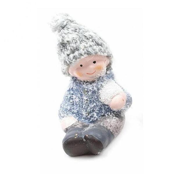 Szürke sapkás ülő kisfiú. Mérete: 60x95x55 mm