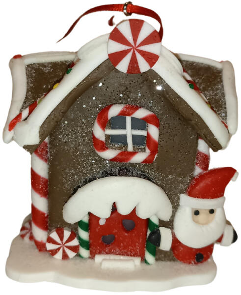 Építsd meg saját mesebeli karácsonyi falvadat, melyben mindíg esik a hó, és hangulatos karácsonyi dalok szólnak. Mézeskalács színű apró világító házikó, mikulás alakkal. A díszt fel is akaszthatjuk, de asztaldíszként is szép karácsonyi dekoráció. Mérete: 8*8*7,5 cm Működése: 3db LR44-es gombelemmel - tartozék Fényforrás: LED Anyag: műgyanta, így sokáig megörző színét,